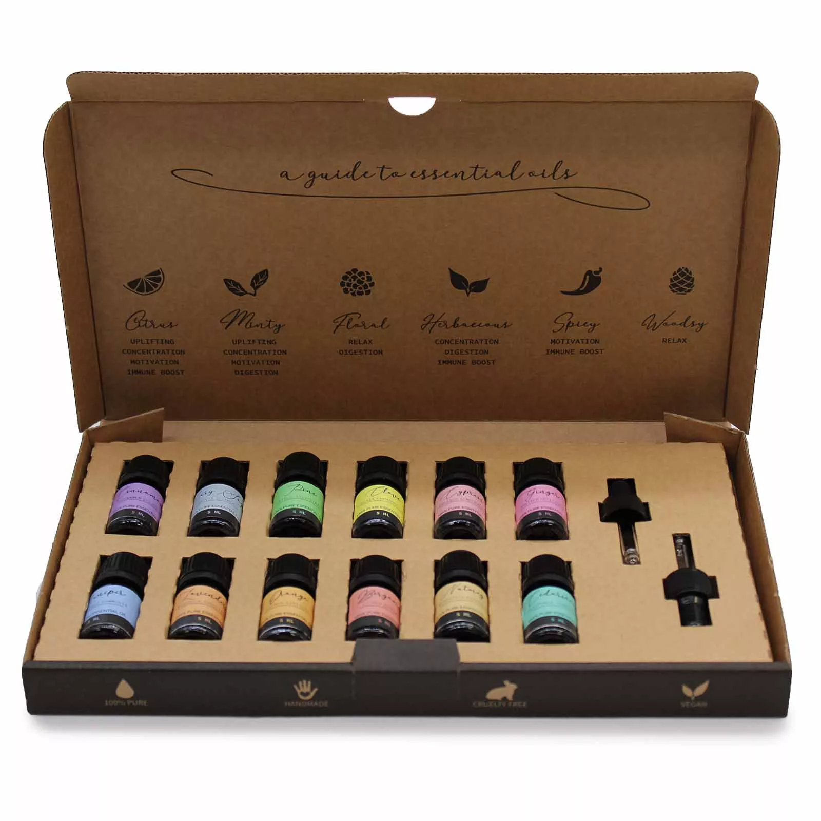 Aromatherapy Essential Oil Set are an amazing gift for home and mind. This set contains 12 essential oils (5ml each) and 2 droppers. Our Essential oil gift set combining a variety of floral, minty, woody, spicy and herbal scents.