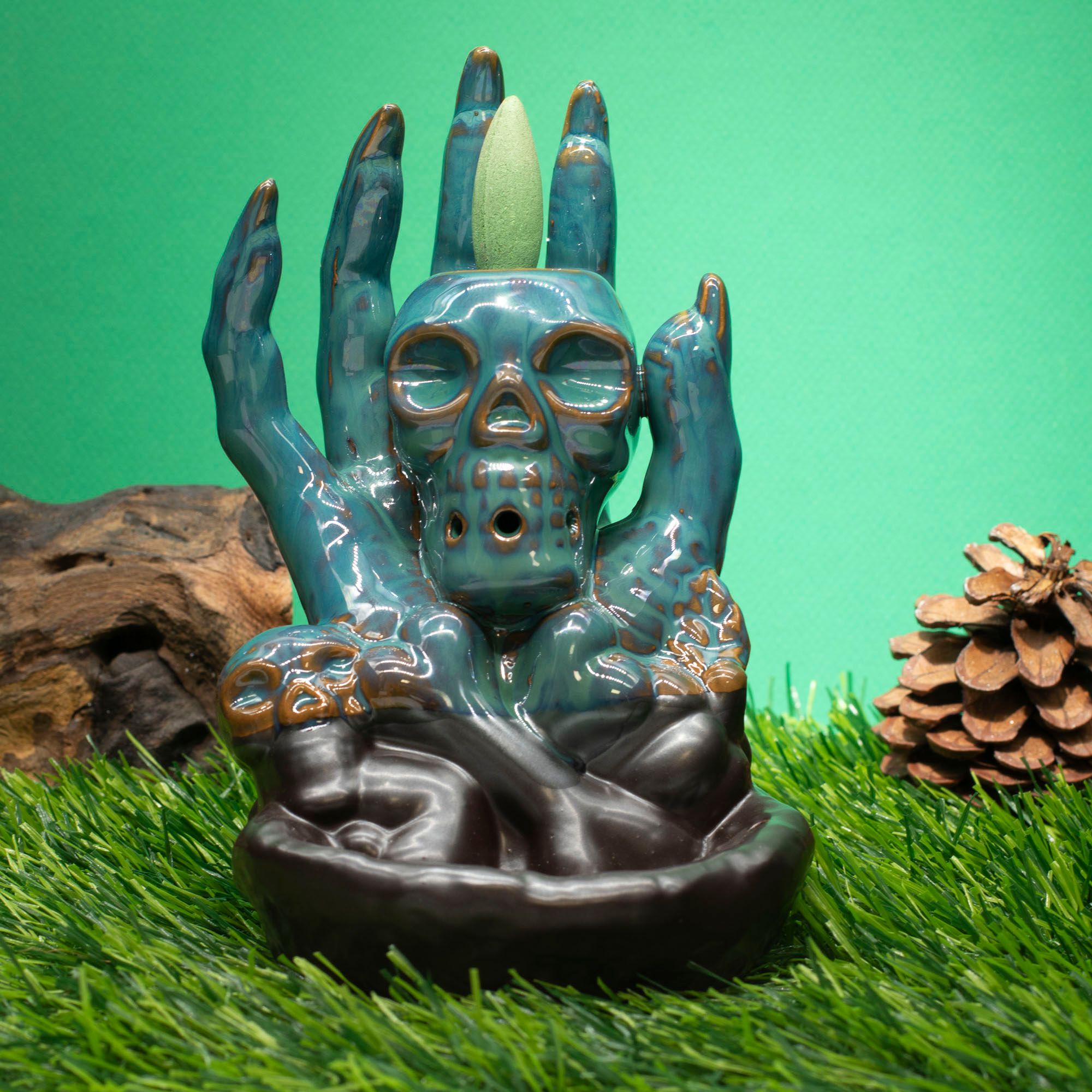 Add a dramatic touch to your space with this Skull in Hand backflow incense burner. Designed for use with backflow incense cones, it creates a striking cascading smoke effect that flows down through the skull and into the base below.