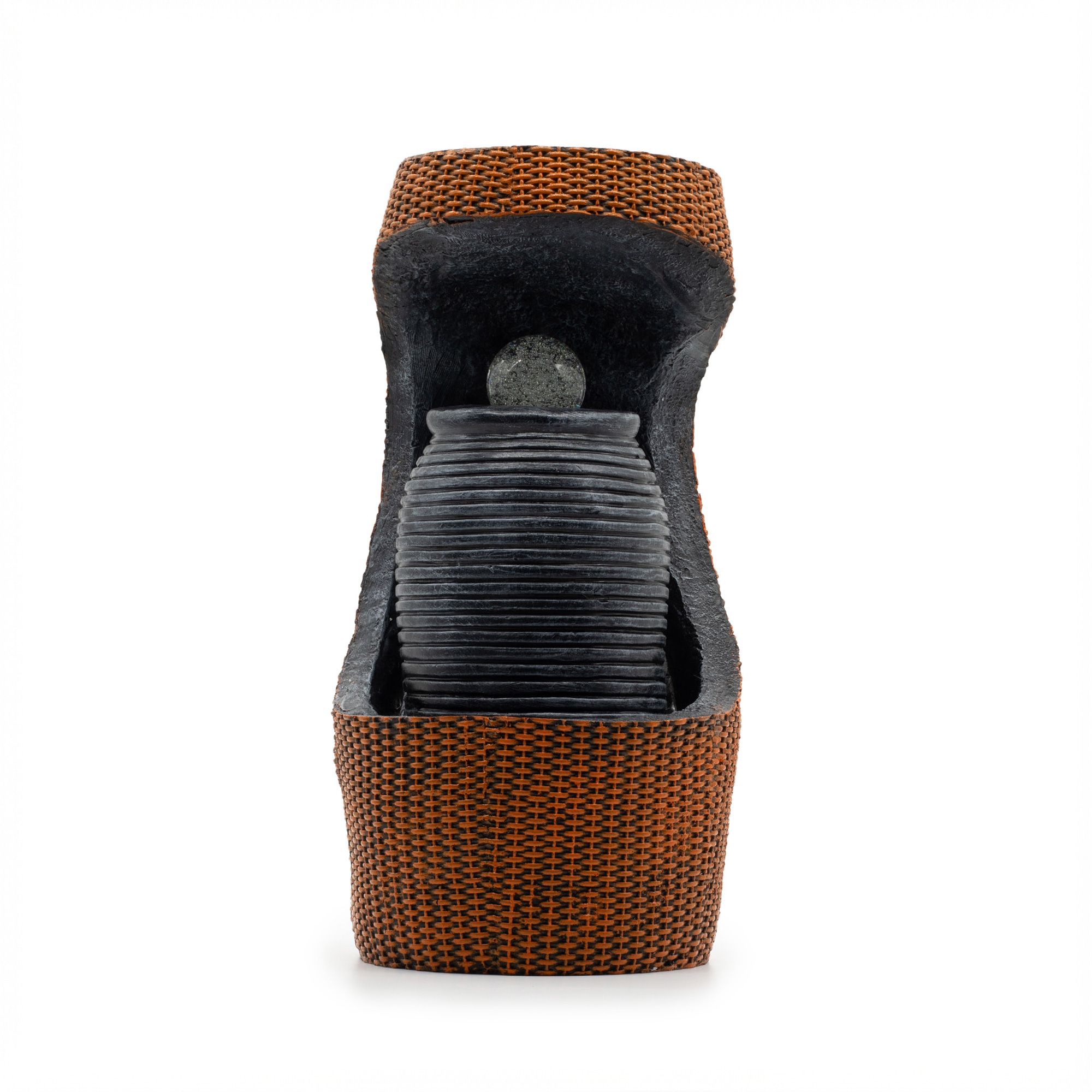 Make a bold yet grounded statement with this Grand Water Feature – Colour Changing Crystal Ball in Greek Urn in Basket. Blending classical form with modern texture, the design echoes the shape of an ancient Greek urn, reimagined through a contemporary lens and framed within a woven basket-style surround.