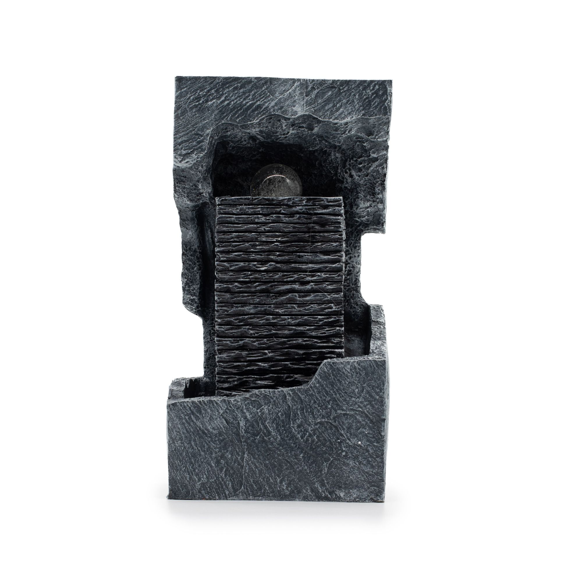 Create a bold, sculptural statement with this Grand Water Feature – Colour Changing Crystal Ball in Rock. Inspired by the look of a fractured stone column, the design feels like a piece of contemporary art, as if a solid architectural form has been broken open to reveal flowing water and light within.