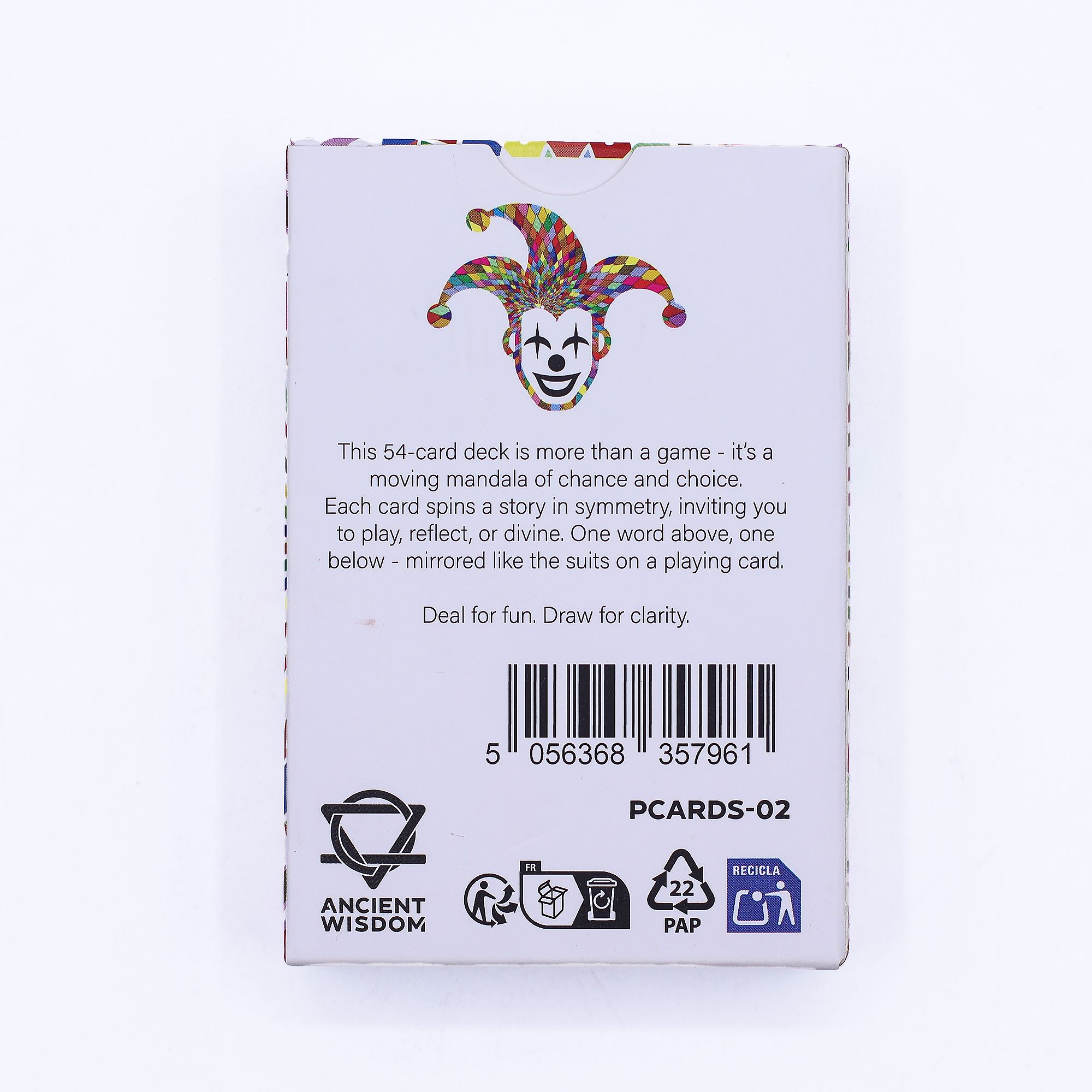 This luminous 54-card deck brings colour, clarity, and reflection to your table. Use it for classic card games or as an oracle for mindful insight — each mandala design echoes the balance of life’s choices and the harmony between play and purpose.