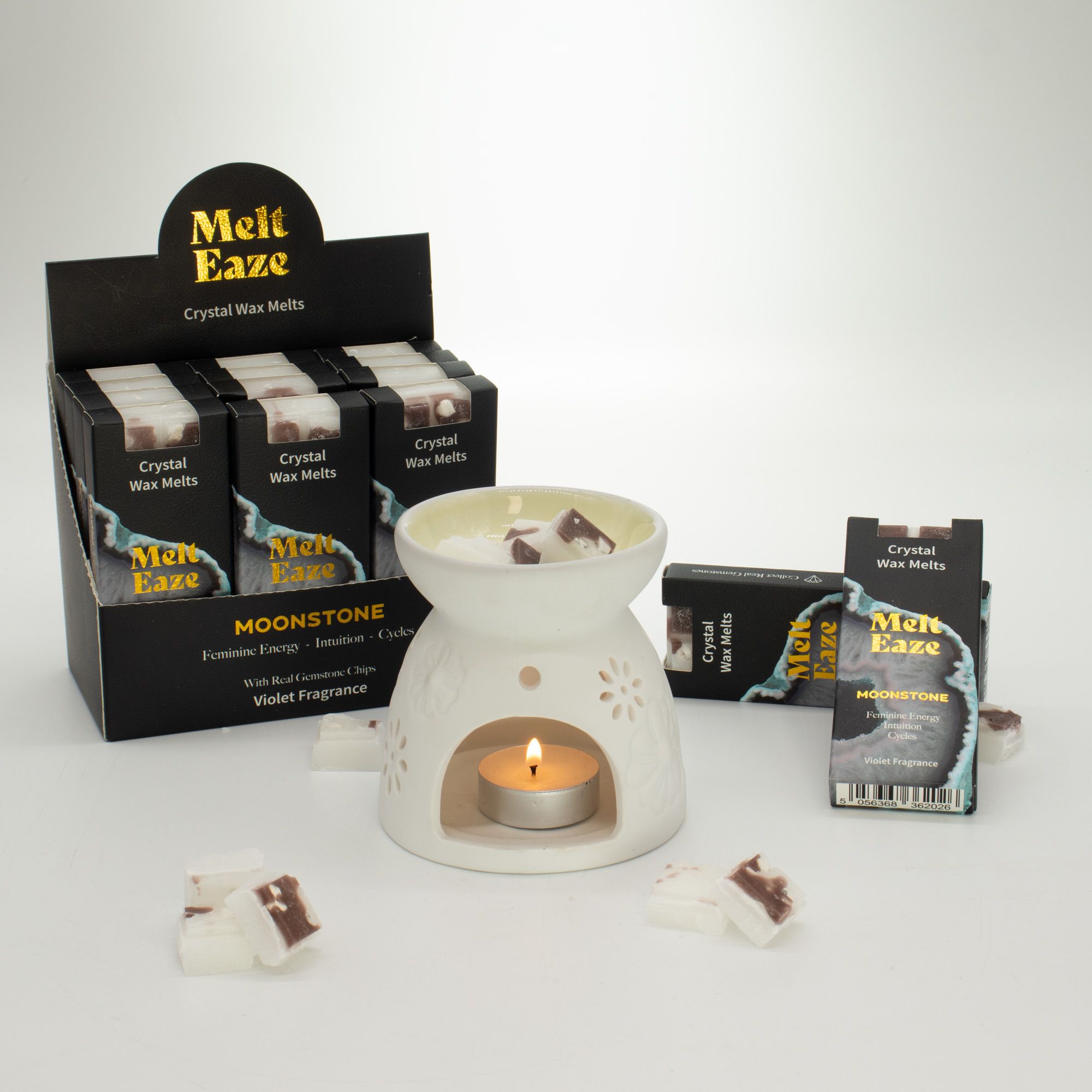 Bring a soft, dreamy atmosphere into your space with MeltEaze Moonstone Glow Wax Melts. Gentle tones and a delicate violet fragrance are paired with Moonstone, often associated with feminine energy, intuition, and natural cycles.