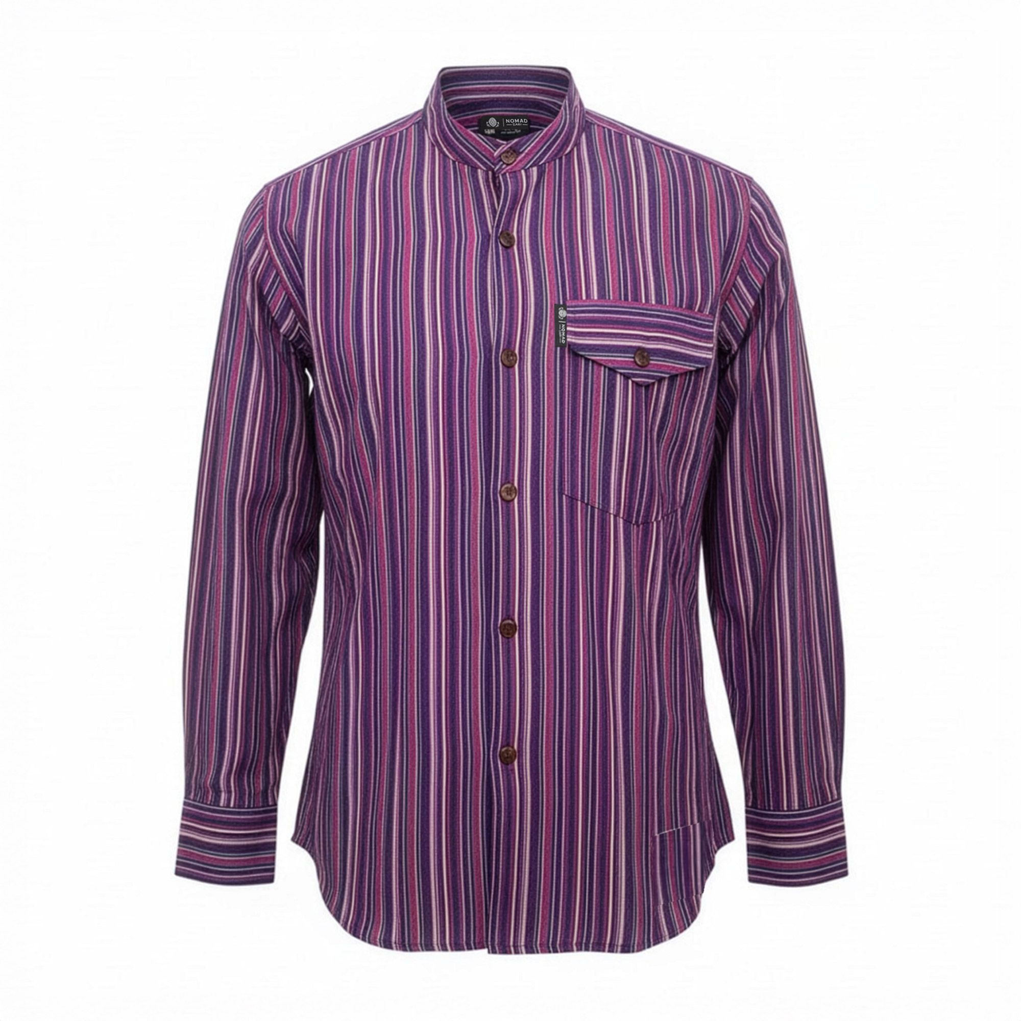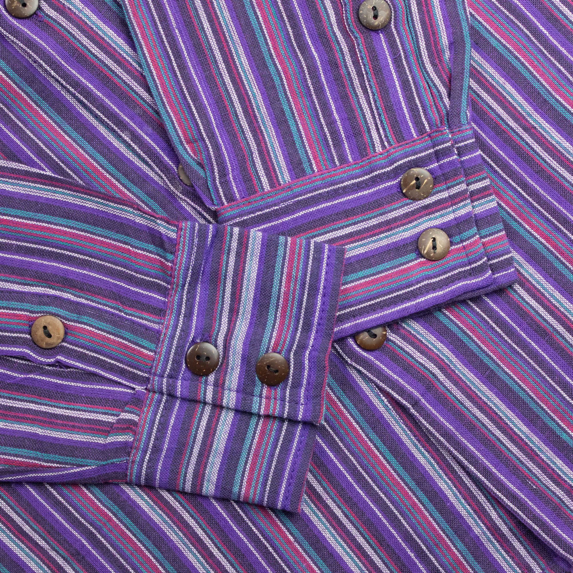 he Nomad Sari Grandad Shirt in Black Purple stands out with bold vertical stripes in rich purple tones. The collarless neckline and classic button front give it a relaxed, timeless look, while the striking colour combination adds personality without feeling over the top.