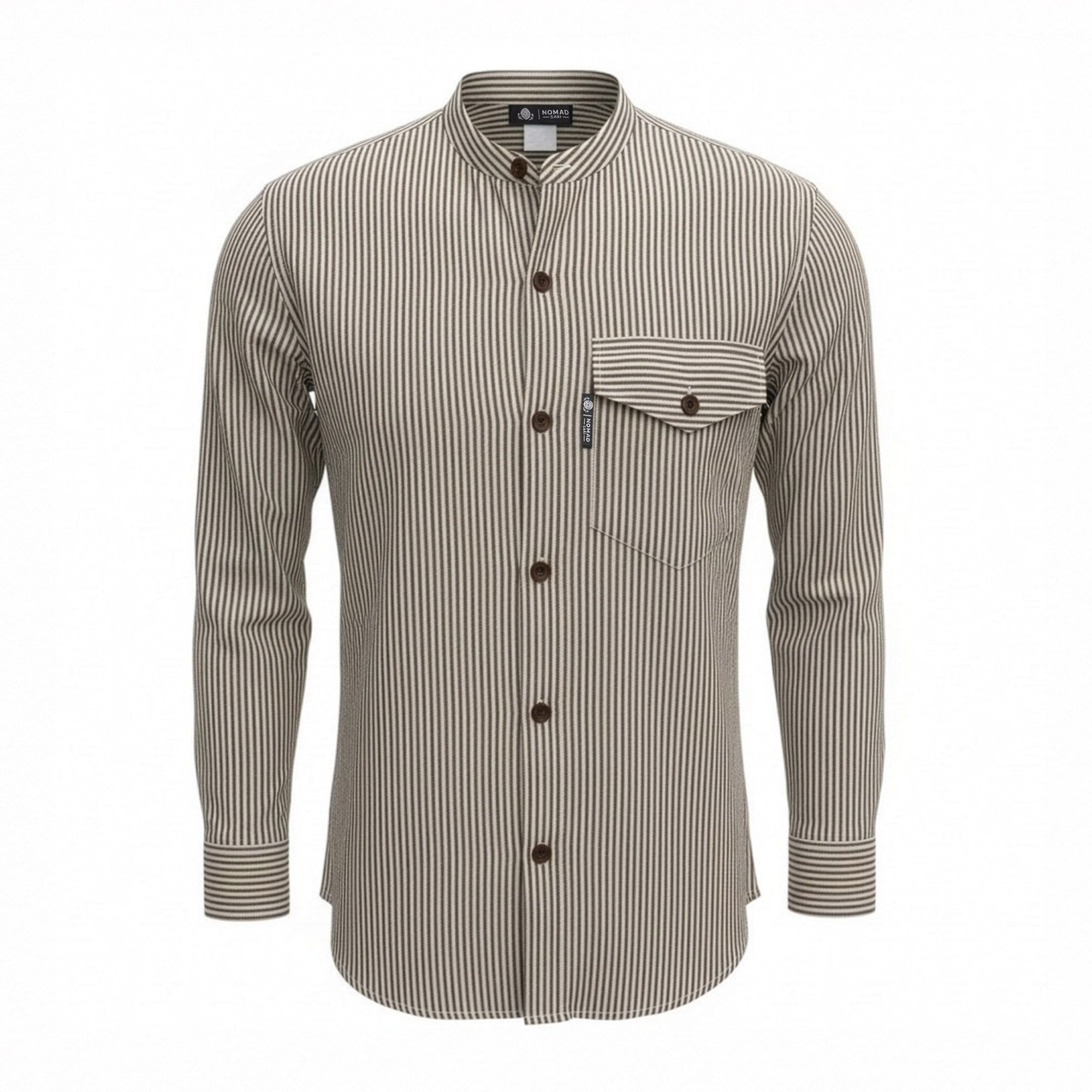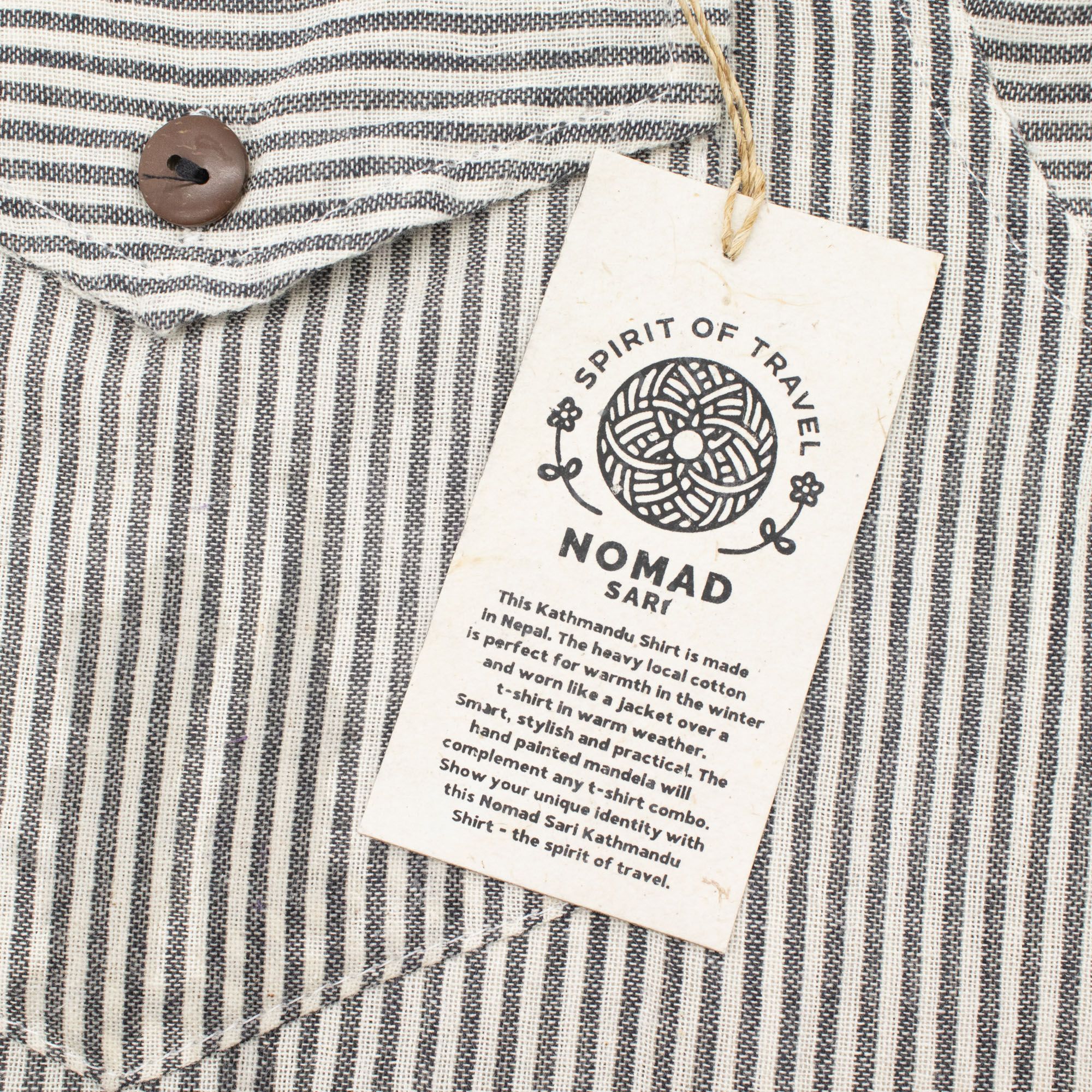 The Nomad Sari Grandad Shirt in Grey Stone features subtle vertical stripes in soft neutral tones, giving it a relaxed and timeless feel. The collarless neckline and classic button front keep the look simple and easy to style.