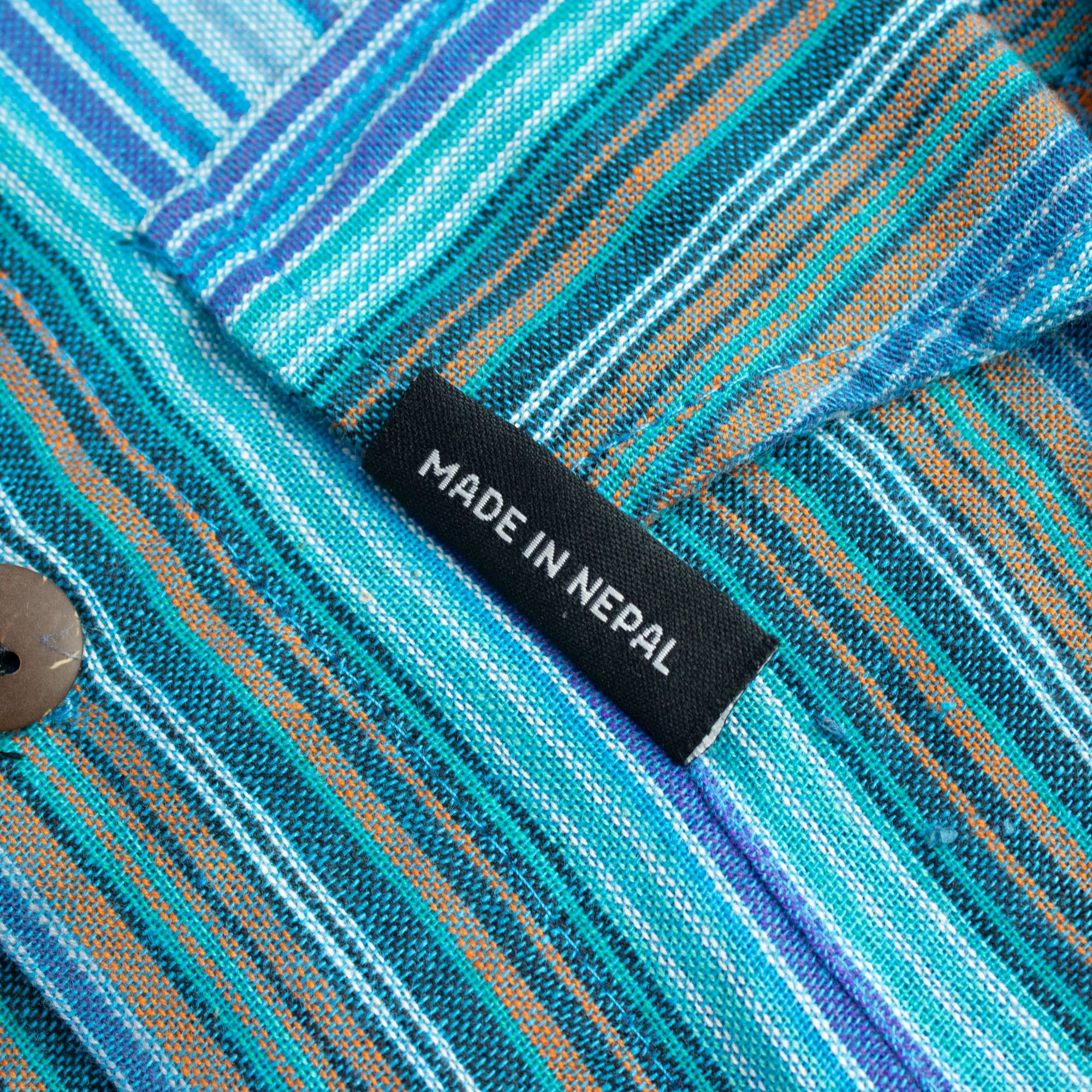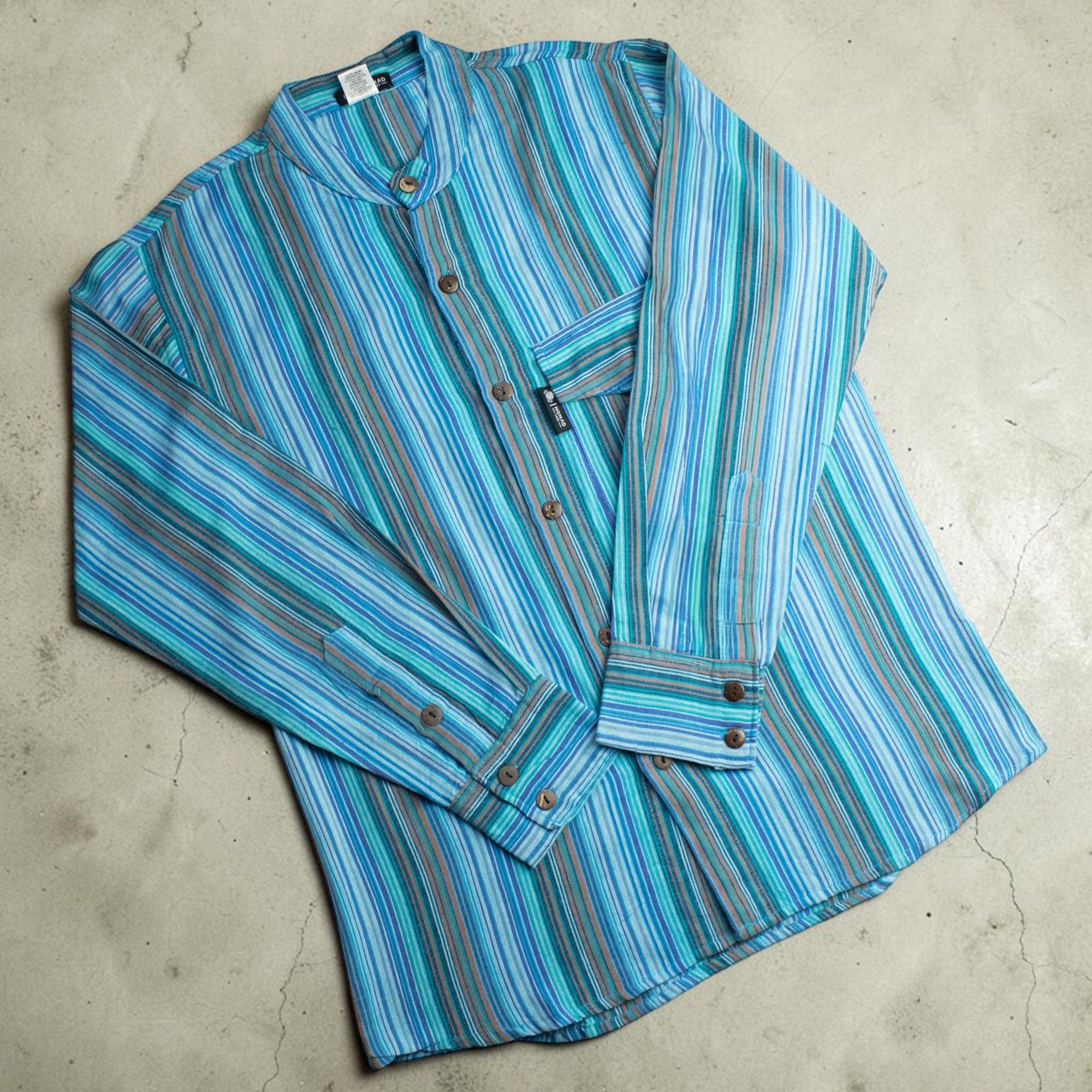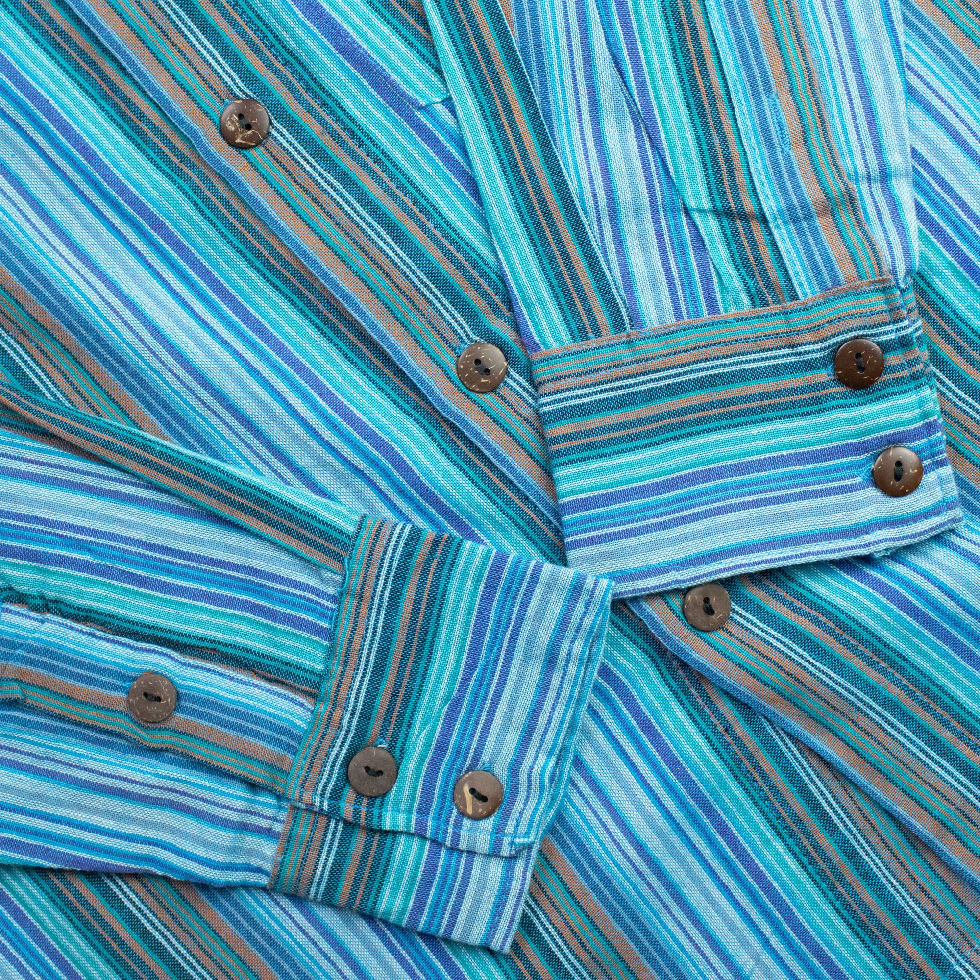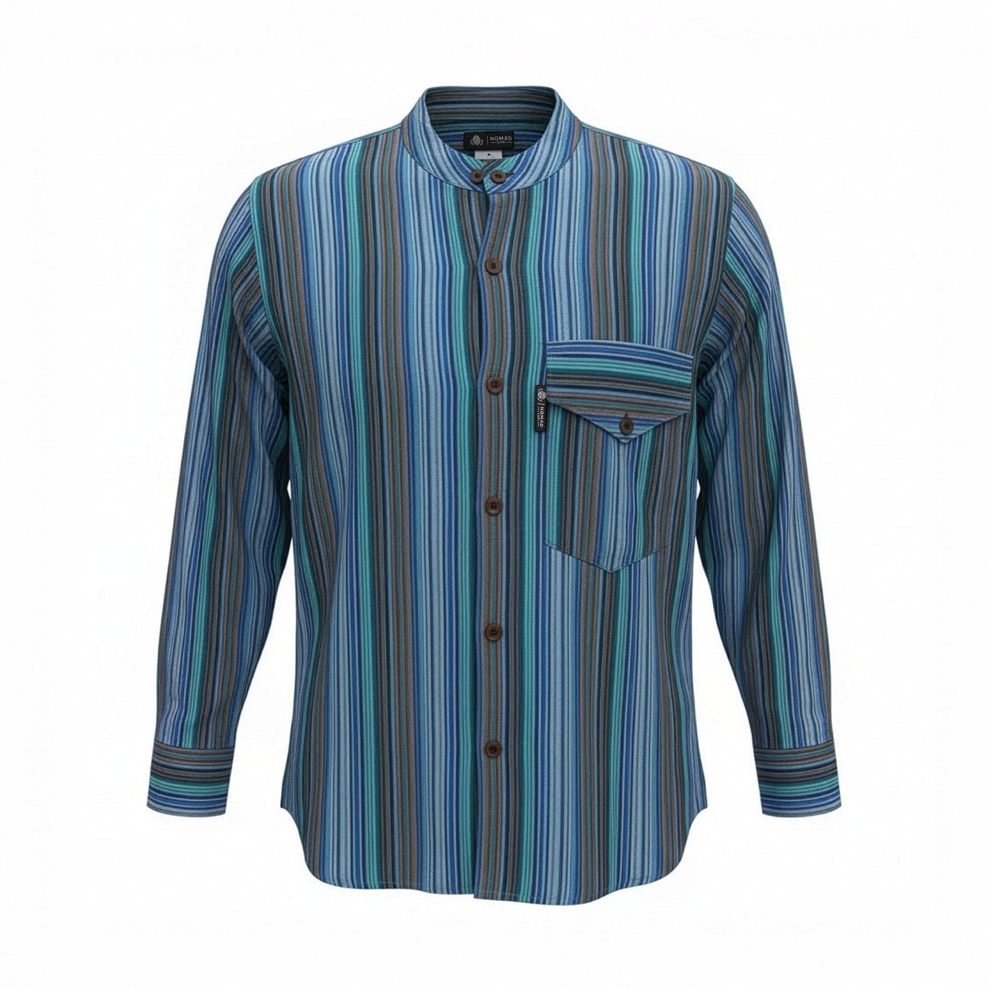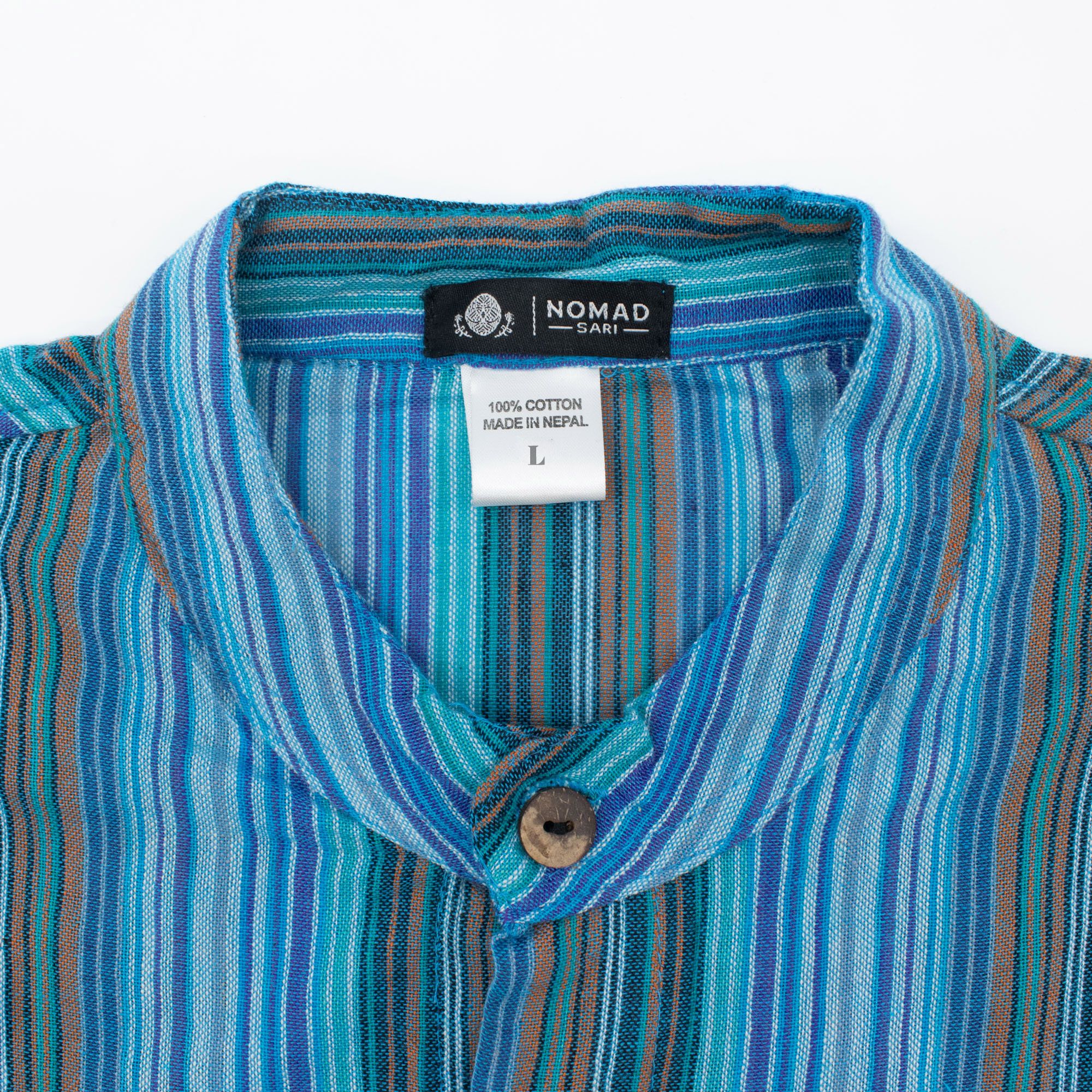 The Nomad Sari Grandad Shirt in Turquoise brings fresh colour and relaxed style together in one easy-to-wear piece. The striped pattern blends shades of turquoise, blue, and earthy tones, giving it a distinctive look inspired by travel and laid-back living.