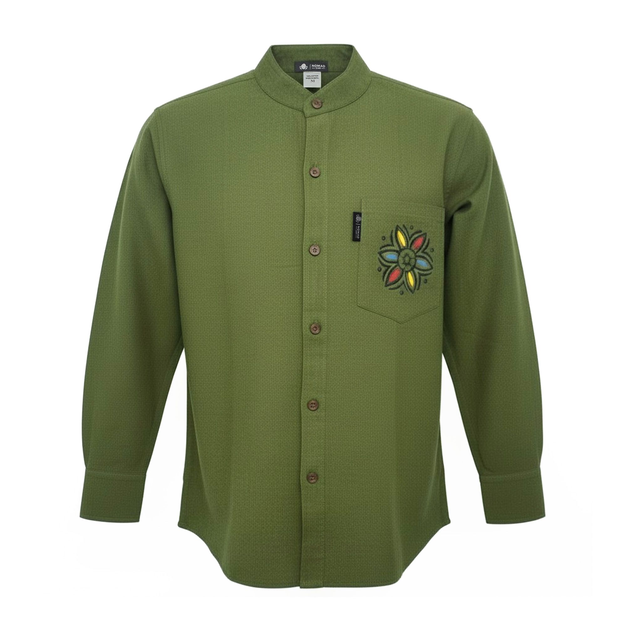 The Nomad Sari Kathmandu Shirt in Forest Green brings relaxed, travel-inspired style with a clean collarless design and subtle hand-painted detail on the chest pocket. The rich green tone and minimalist look create a timeless piece that feels both distinctive and easy to wear.