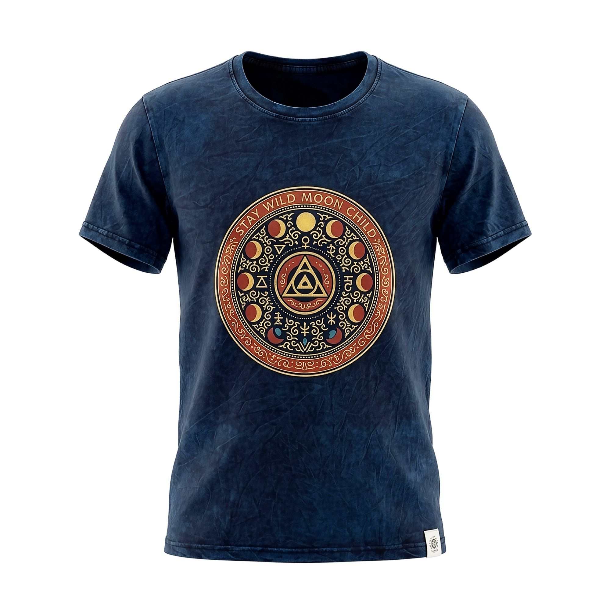 The Nomad Sari Stonewashed Cotton T-Shirt in Blue features a Stay Wild Moon Child design inspired by celestial symbols and free-spirited style. The deep blue tone combined with the vintage stonewashed finish creates a relaxed, worn-in look with subtle variations that make each piece unique.