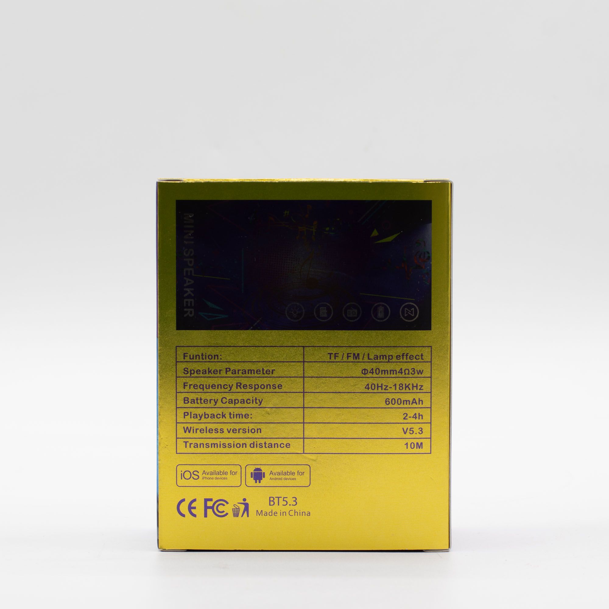 A compact mini speaker with a silver finish and mandala-style lighting effect, designed for portable everyday use. The circular design fits comfortably in the hand and includes an integrated carry loop for easy transport.