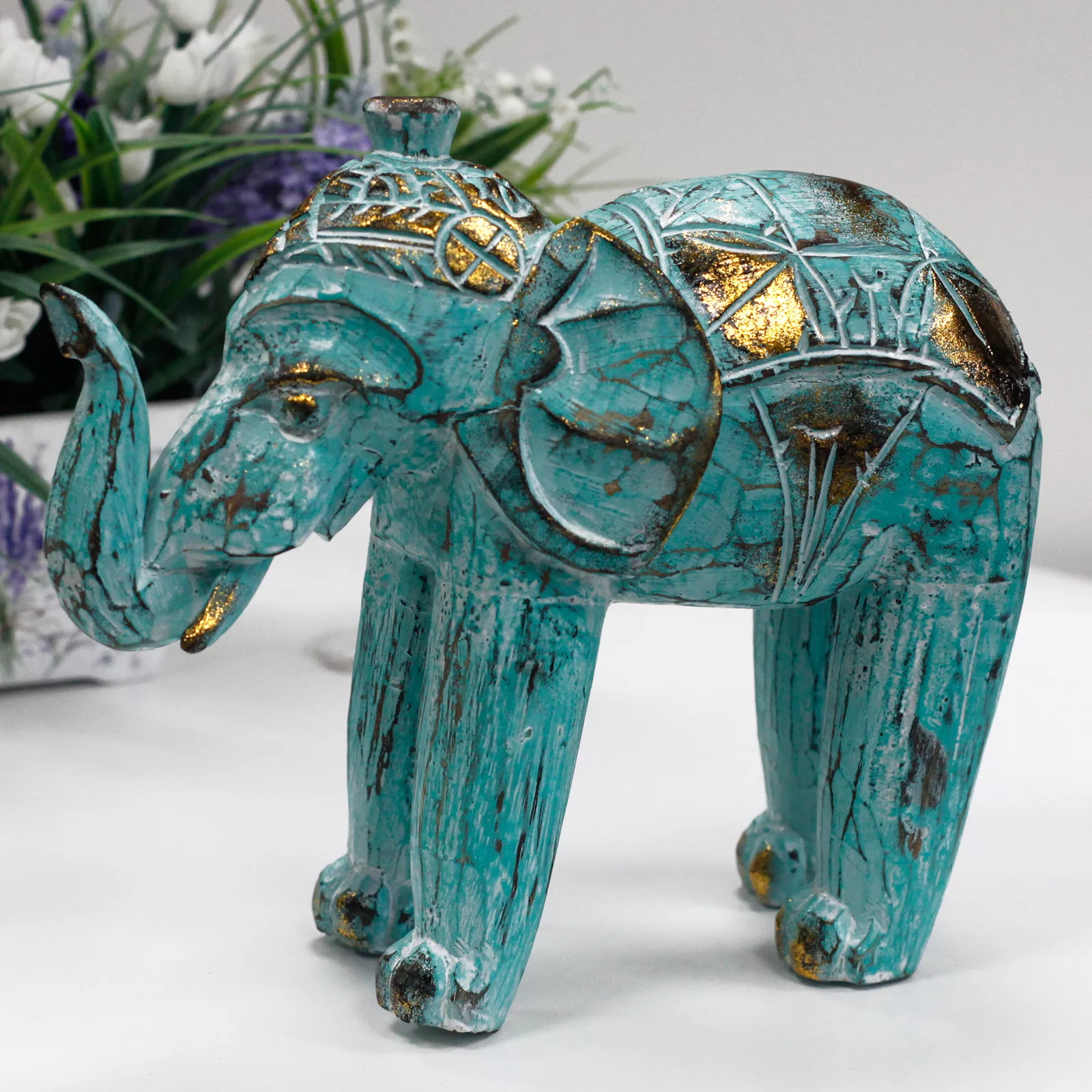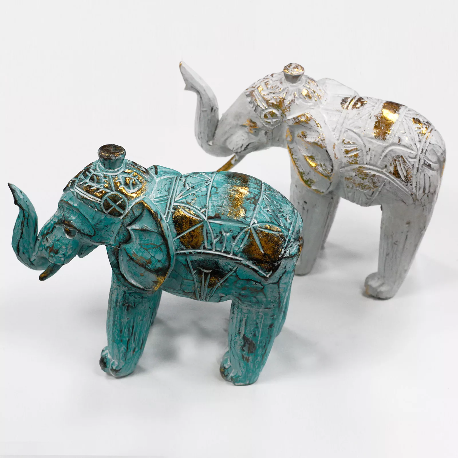 These Elephants have been lightly painted in white and turquoise colours and added a golden glitter to it for Onyx Dragon.