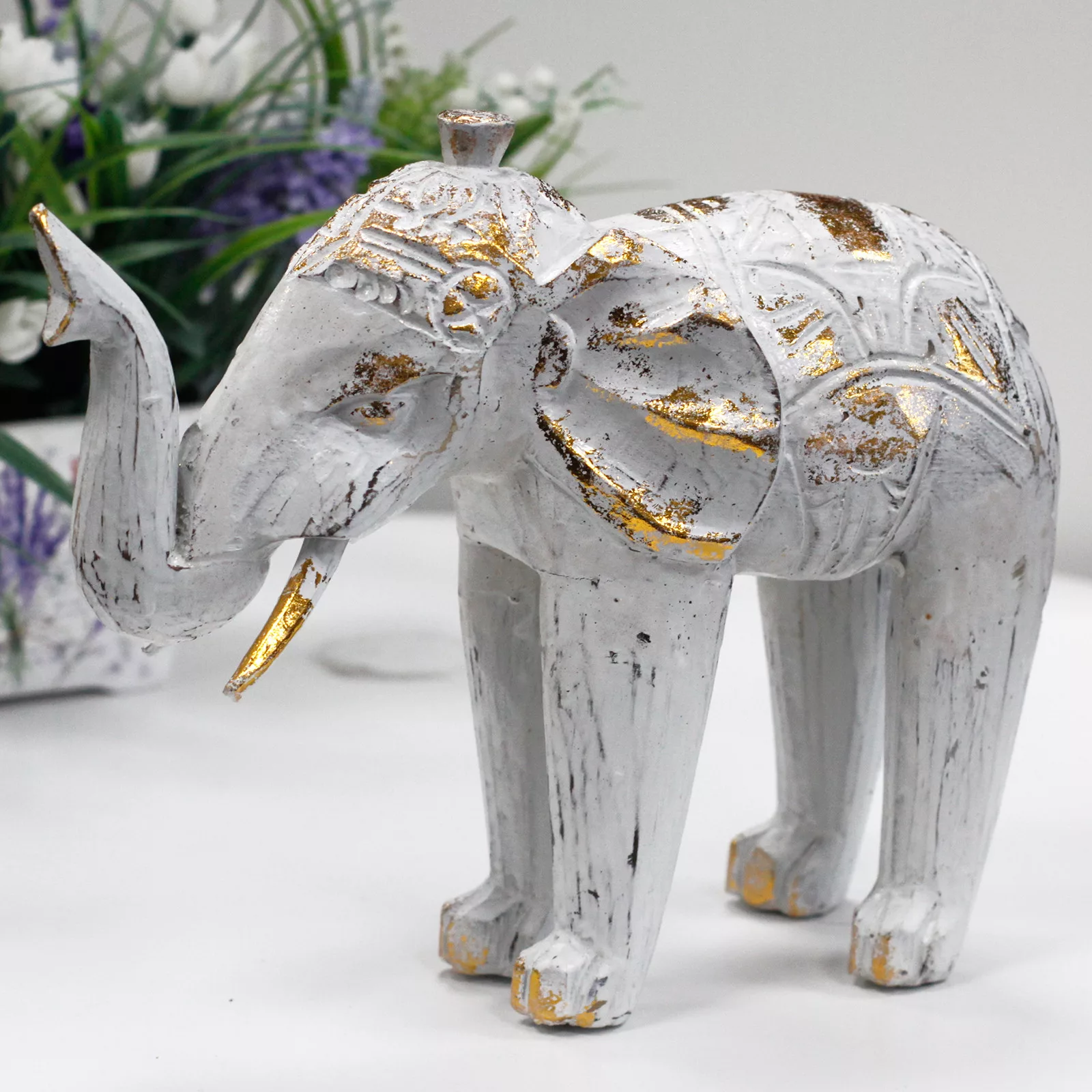 Wood Carved Elephant – White Gold